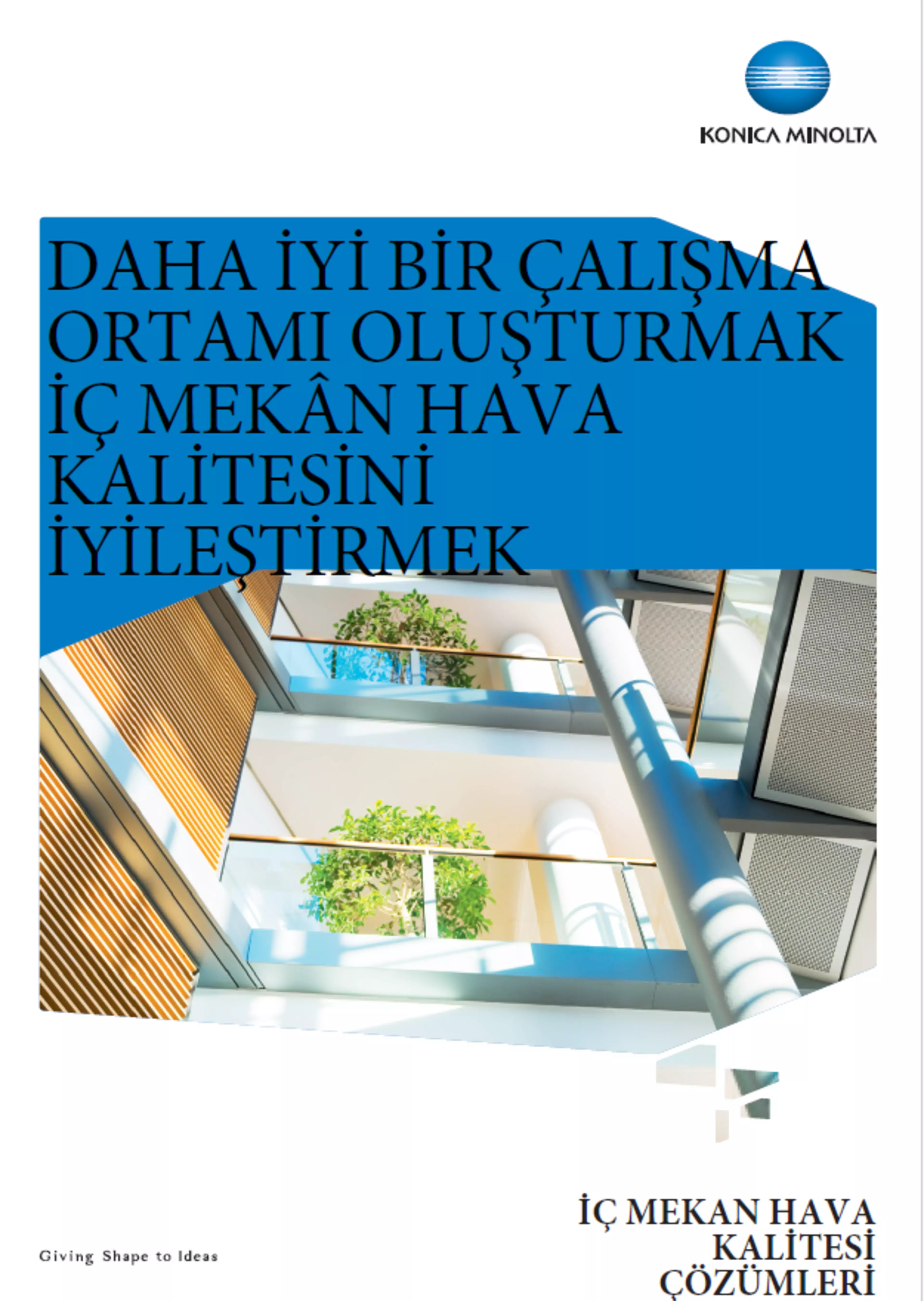 Konica Minolta, müşterilerinin çalışma ortamını aktif olarak iyileştirmeye ve onların temel yetkinliklerine odaklanmaları için uygun alan yaratmaya kendini adamıştır. Ofis içindeki havanın temizliği, çalışanların sağlığı ve konforu üzerinde doğrudan etkili olduğundan, İç Mekân Hava Kalitesi hizmeti genel sağlık ve refah seviyesini artırmayı hedefler.